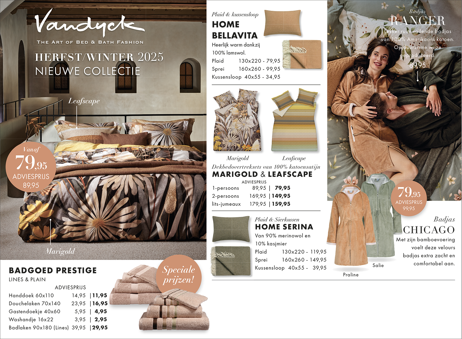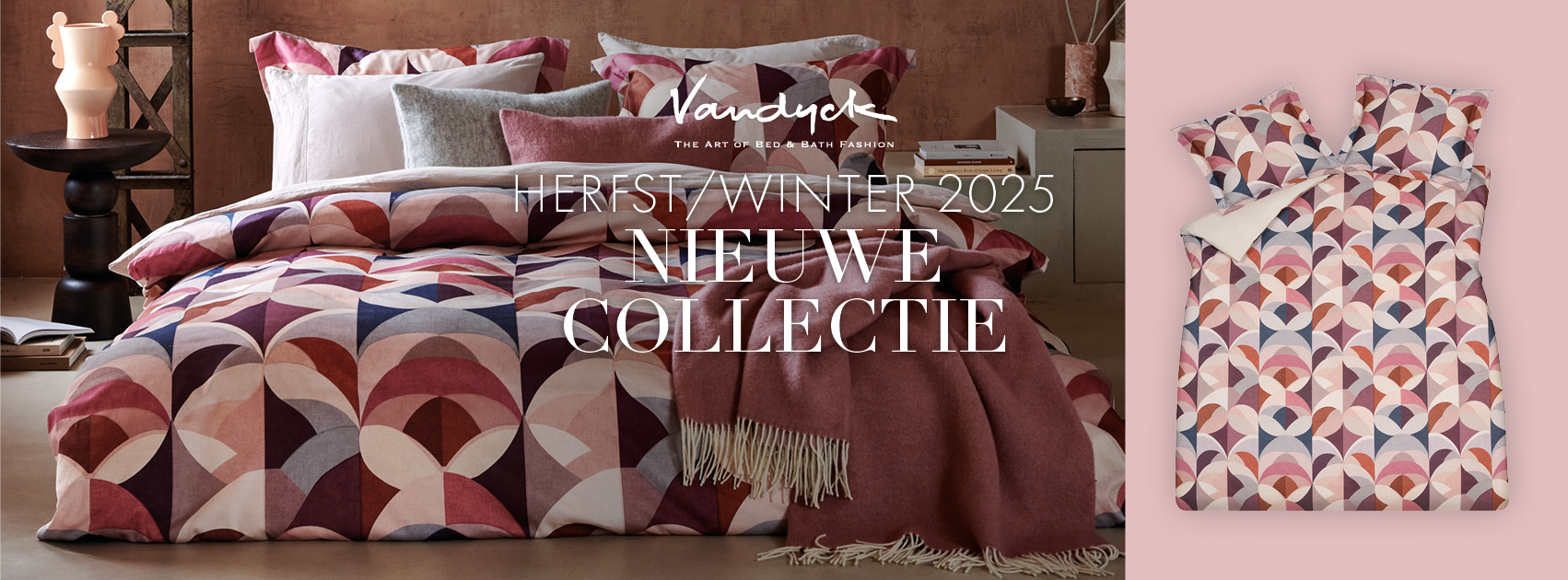 De bed- en badgoedcollecties van Vandyck wisselen per seizoen en volgen de trends op het gebied van wonen en slapen. Elk seizoen als de nieuwe collectie uitkomt verspreidt Vandyck een mooie folder, waarin een impressie staat van het prachtige aanbod. En denk daarbij niet alleen aan een mooi dekbedovertrek, maar ook aan heerlijk zachte handdoeken en kleurrijke badjassen.