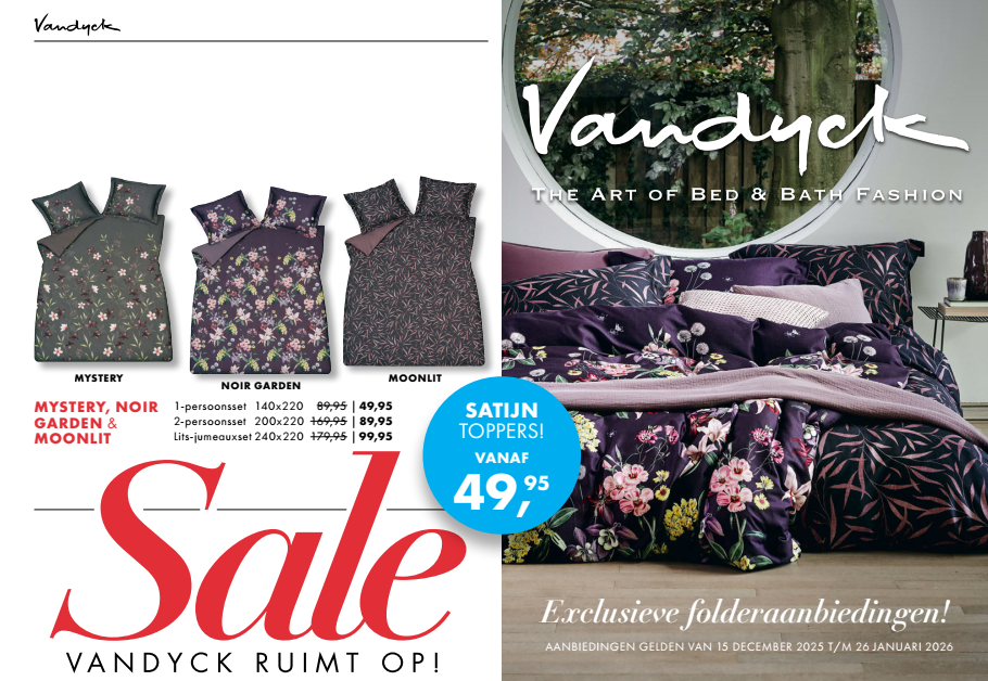 De bed- en badgoedcollecties van Vandyck wisselen per seizoen en volgen de trends op het gebied van wonen en slapen. Elk seizoen als de nieuwe collectie uitkomt verspreidt Vandyck een mooie folder, waarin een impressie staat van het prachtige aanbod. En denk daarbij niet alleen aan een mooi dekbedovertrek, maar ook aan heerlijk zachte handdoeken en kleurrijke badjassen.